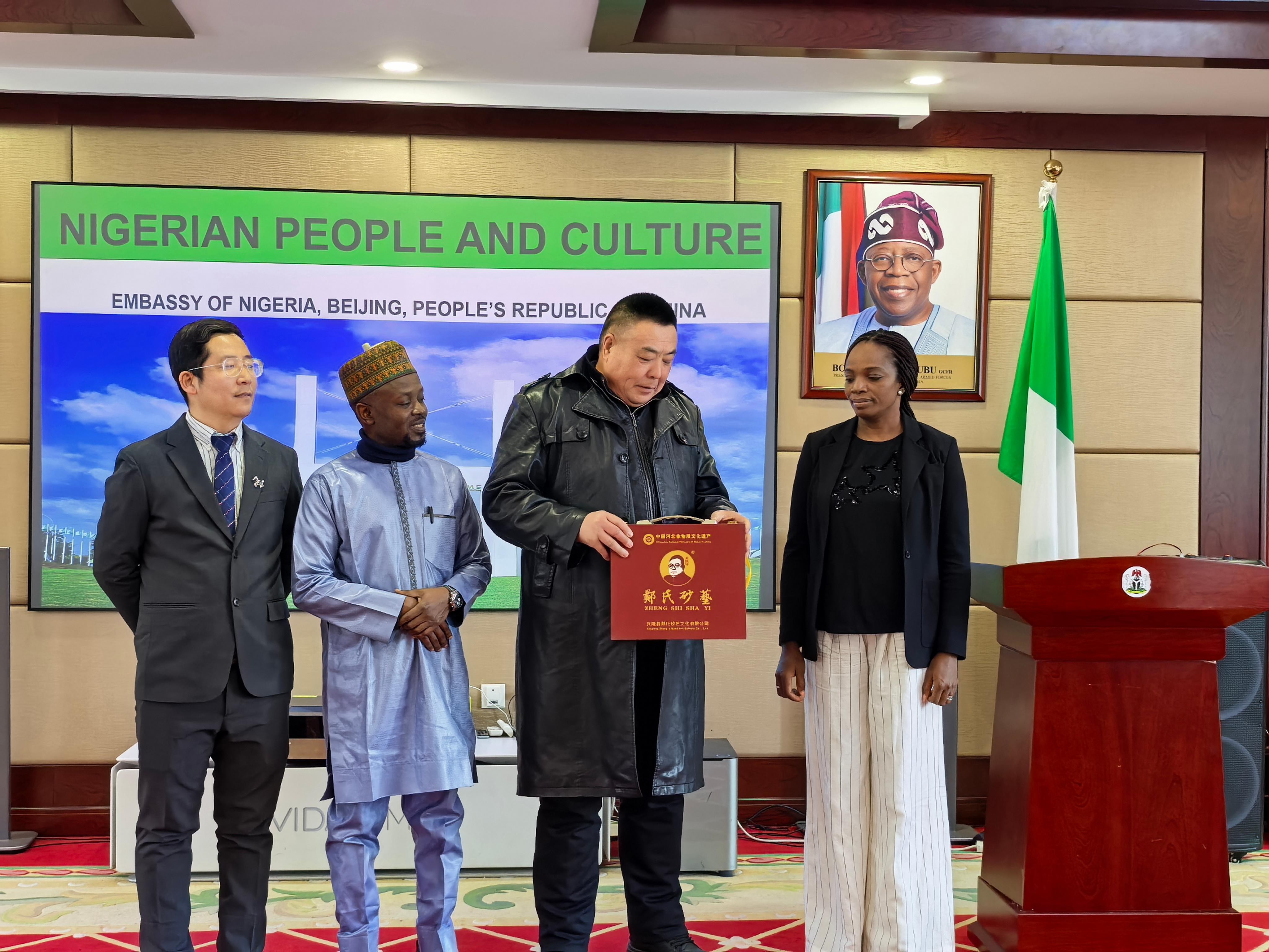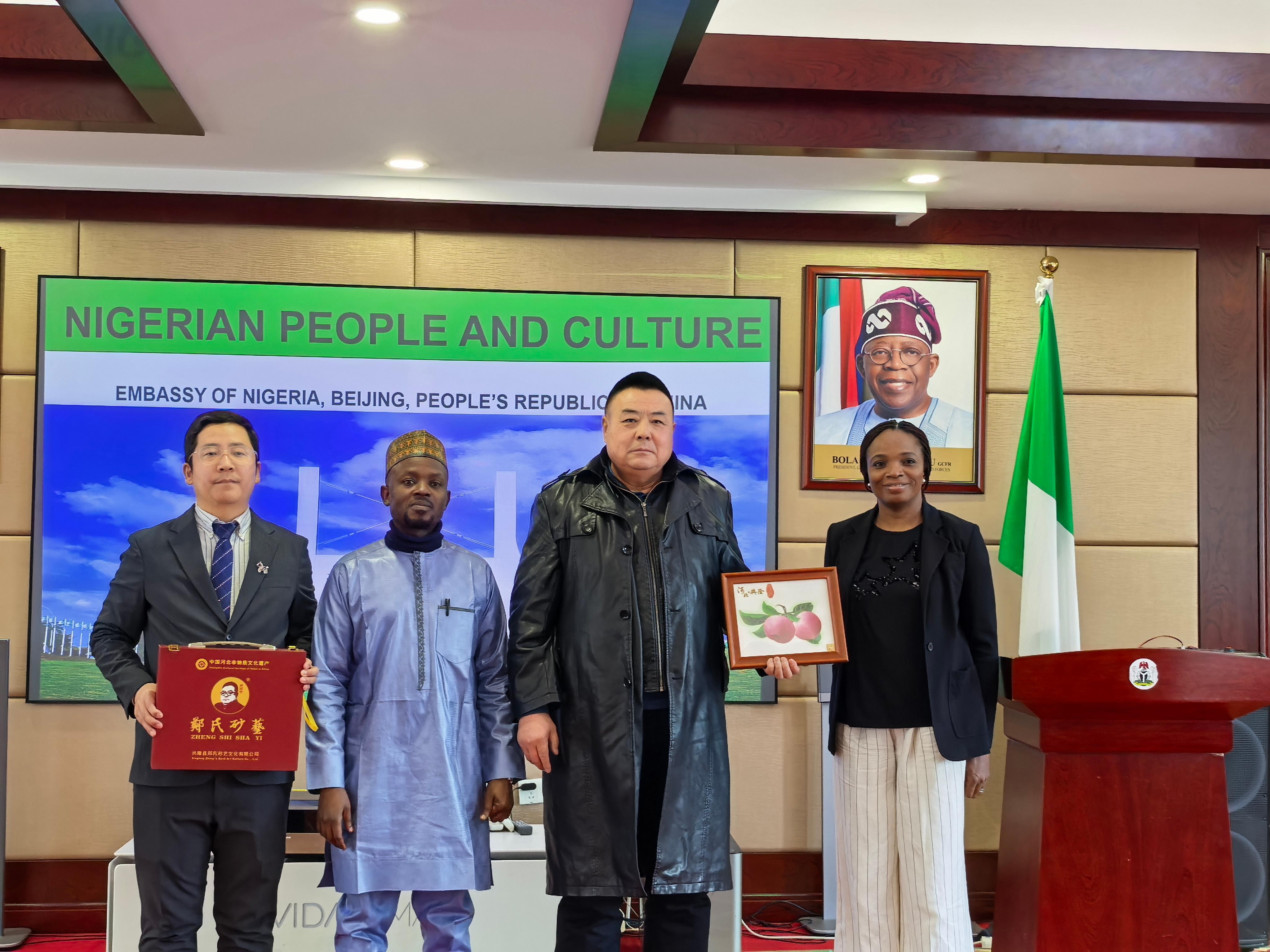 鄭鐵軍老師介紹道:“鄭氏砂藝起源于晚清秀才鄭克祥,歷經百年時光沉淀與五代匠人的薪火相傳,于21世紀初成功躋身省級非物質文化遺產名錄。該砂藝原料采自燕山腳下的彩色礦山,經精細研磨后,再經設計、制圖、掐絲、點藍、封裝等多道工序悉心雕琢,每件作品都承載著燕趙大地深厚的文化基因。此次收藏的砂藝作品《平安》更是寓意平安、吉祥與和諧,象征兩國發展蒸蒸日上。”尼日利亞駐華大使對這件砂藝作品贊不絕口,由衷贊嘆道:“這件作品讓我深切感受到中華文化的博大精深。”大使當場宣布收藏這件作品,并簽字留念,同時表示:“鄭氏砂藝融合自然與人文,彰顯中國文化魅力;中尼文化交流搭建起相互了解的橋梁,期待更多非遺項目互鑒互融。我將把這件作品陳列在使館文化區,以此見證中尼文化交流的深厚情誼。”